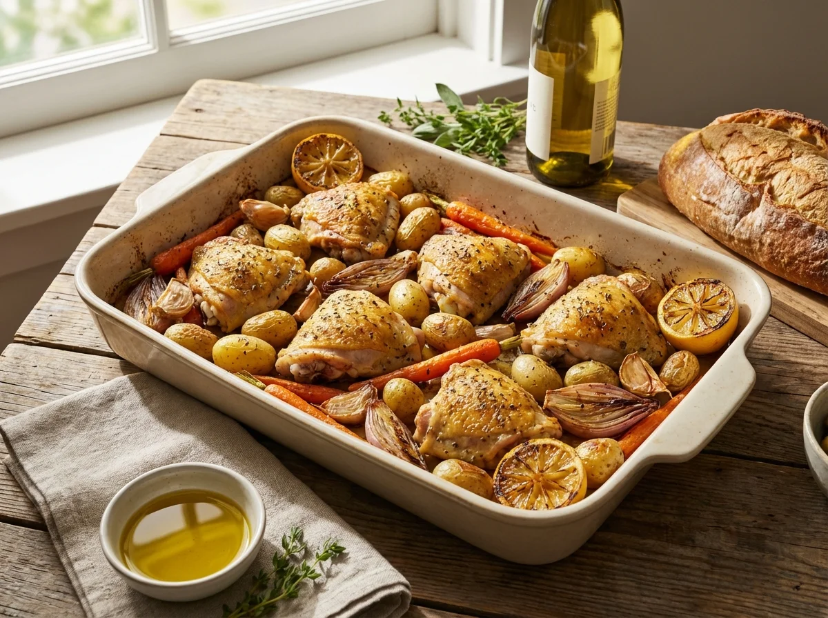 A warm, practical, and dependable weeknight dinner. With crisp-edged potatoes, sweet roasted shallots, and juicy chicken thighs, the real star is the simple, garlicky pan sauce that you will want to spoon over absolutely everything. Made with realistic supermarket ingredients for a stress-free meal.